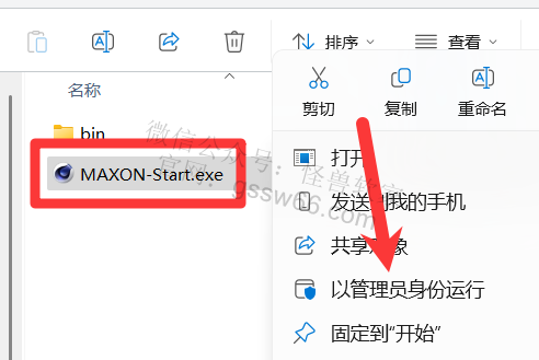 04,找到并选中“MAXON-Start.exe”安装程序,点击鼠标右键,点击“以管理员身份运行”