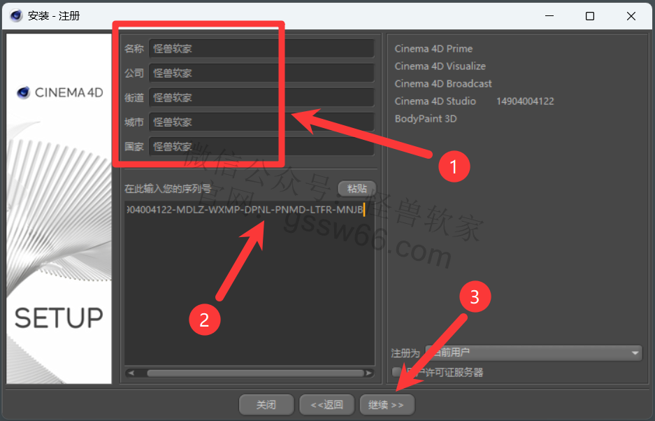 08,输入“名称、公司、街道、城市、国家”信息(可随便填写),输入序列号:14904004122-MDLZ-WXMP-DPNL-PNMD-LTFR-MNJB,点击“继续”