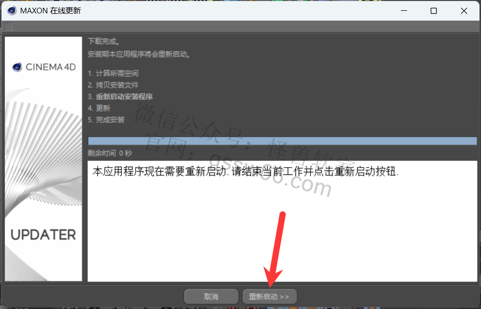 32,点击“重新启动”,安装更新包完成