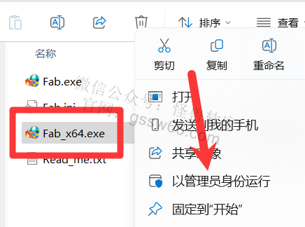 17,找到并选中“Fab_x64.exe”程序,点击鼠标右键,点击“以管理员身份运行”