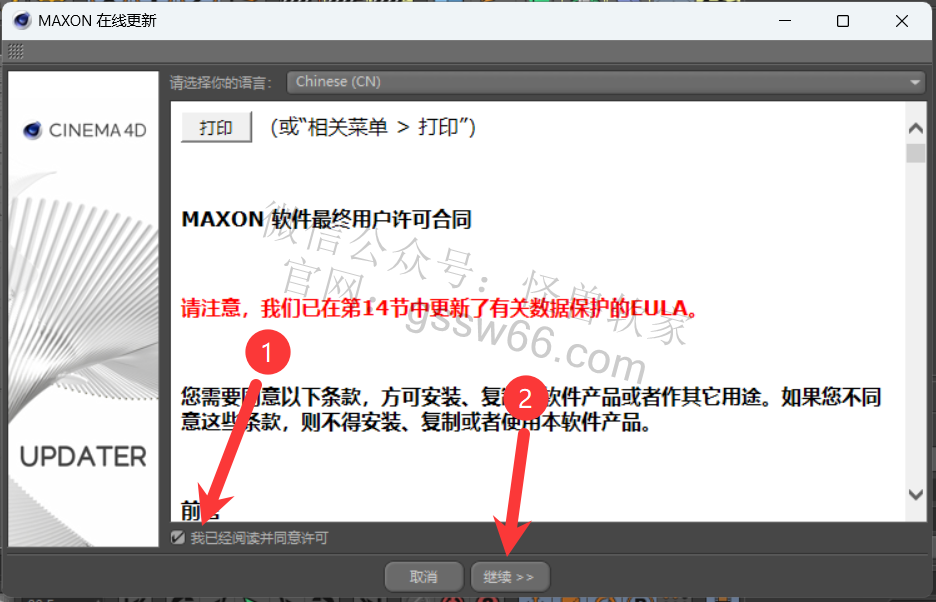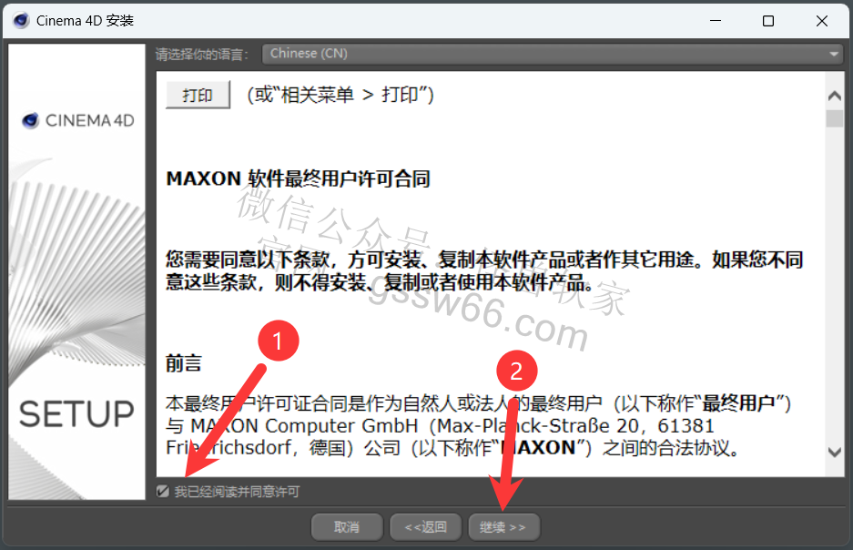 30,勾选“我已经阅读并同意许可”,点击“继续”