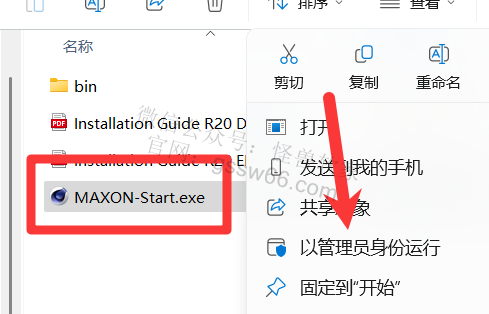 04,找到并选中“MAXON-Start.exe”安装程序,点击鼠标右键,点击“以管理员身份运行”