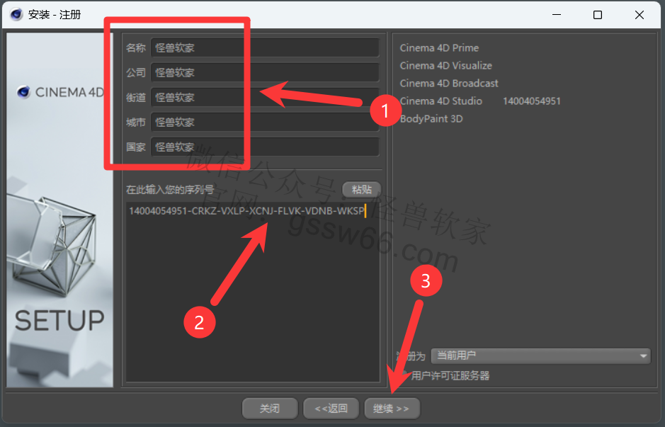 08,输入“名称、公司、街道、城市、国家”信息(可随便填写),输入序列号:14004054951-CRKZ-VXLP-XCNJ-FLVK-VDNB-WKSP,点击“继续”
