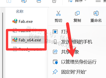 17,找到并选中“Fab_x64.exe”程序,点击鼠标右键,点击“以管理员身份运行”