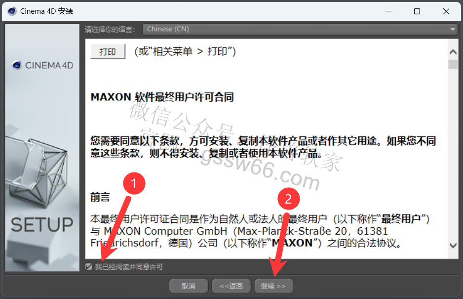 11,勾选“我已经阅读并同意许可”,点击“继续”