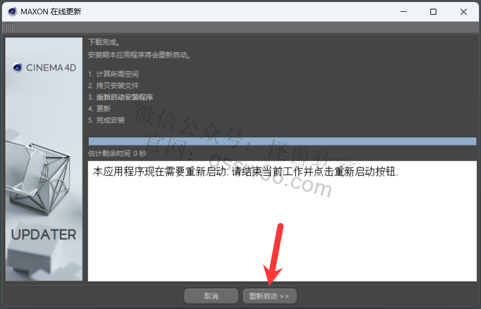 29,点击“重新启动”,安装更新包完成