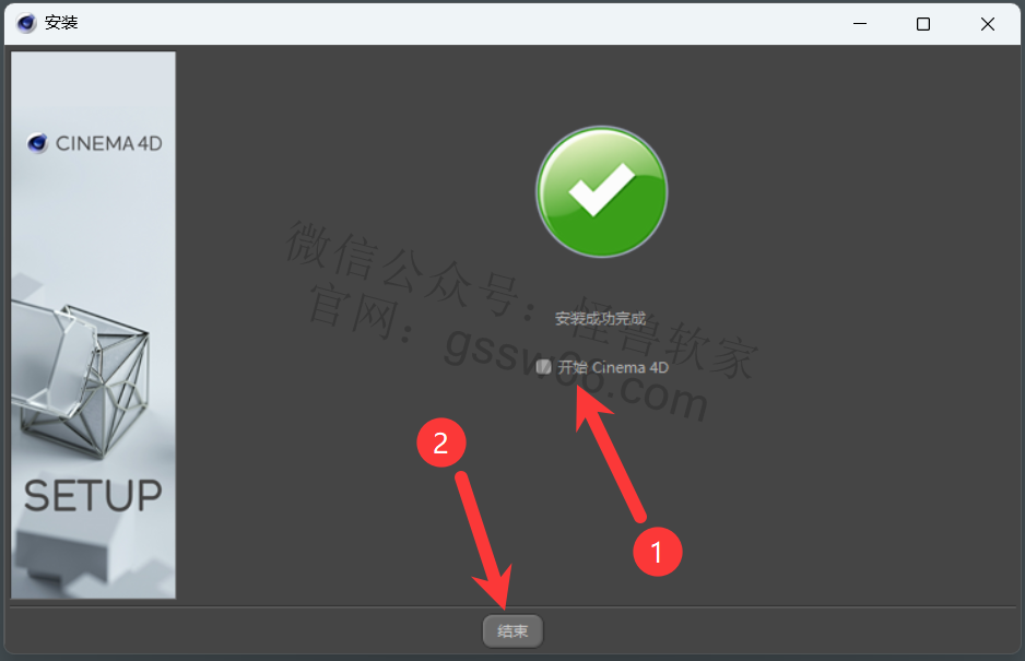15,取消勾选“开始Cinema 4D”,点击“结束”