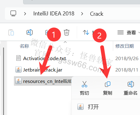 32,打开之前的“Crack”文件夹,找到并选中“resources_cn_IntelliJIDEA_2018.1_r2.jar”文件,点击鼠标右键,点击“复制”