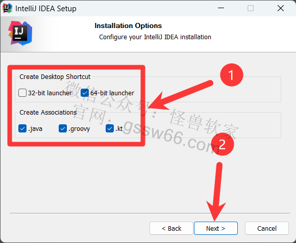 08,勾选“64-bit launcher”,勾选“.java、.groovy、.kt”,点击“Next”