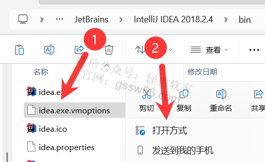16,完成粘贴操作后,在同一目录下找到“idea.exe.vmoptions”文件,选中此文件,点击鼠标右键,点击“打开方式”