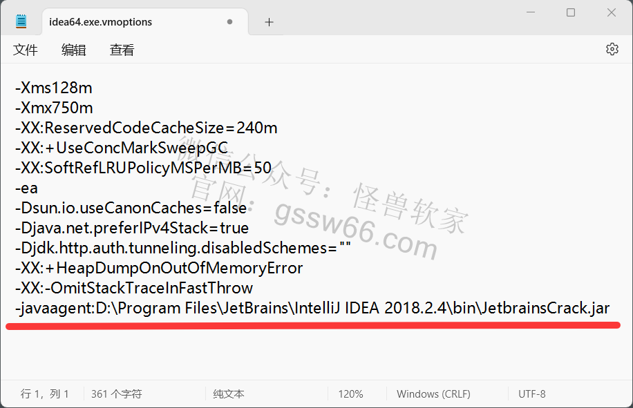 21,在文档的尾部加上“-javaagent:IntelliJ IDEA安装路径\JetbrainsCrack.jar”(如:-javaagent:D:\Program Files\JetBrains\IntelliJ IDEA 2018.2.4\bin\JetbrainsCrack.jar)