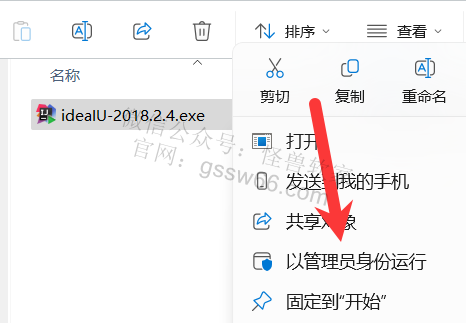 04,找到并选中安装程序“ideaIU-2018.2.4.exe”,点击鼠标右键,点击“以管理员身份运行”