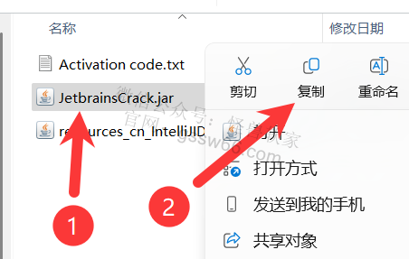 13,找到并选中“JetbrainsCrack.jar”文件,点击鼠标右键,点击“复制”