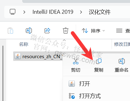 42,找到并选中“resources_zh_CN_IntelliJIDEA_2019.3_r1.jar”文件,点击鼠标右键,点击“复制”