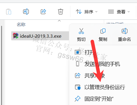 04,找到并选中安装程序“ideaIU-2019.3.3.exe”,点击鼠标右键,点击“以管理员身份运行”