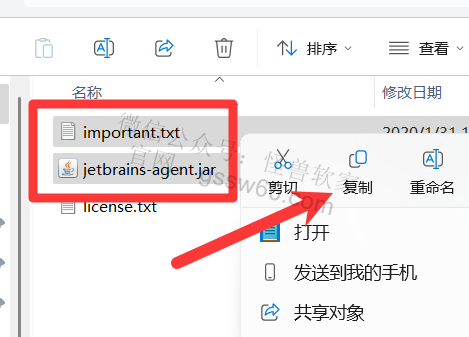 13,找到并选中“important.txt”和“jetbrains-agent.jar”文件,点击鼠标右键,点击“复制”