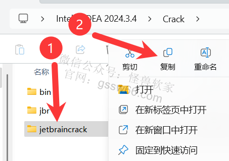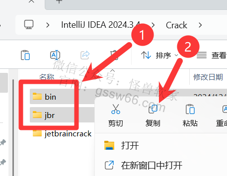 20,回到“Crack”文件夹,找到并选中“bin”和“jbr”文件夹,点击鼠标右键,点击“复制”,或者按键盘上的“Ctrl”+“C”复制