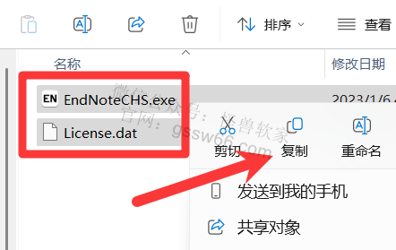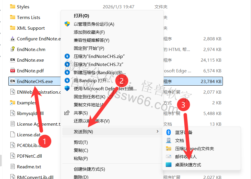 23,完成粘贴操作后,在此文件夹下,找到并选中“EndNoteCHS.exe”文件,点击鼠标右键,依次点击“发送到”—“桌面快捷方式”