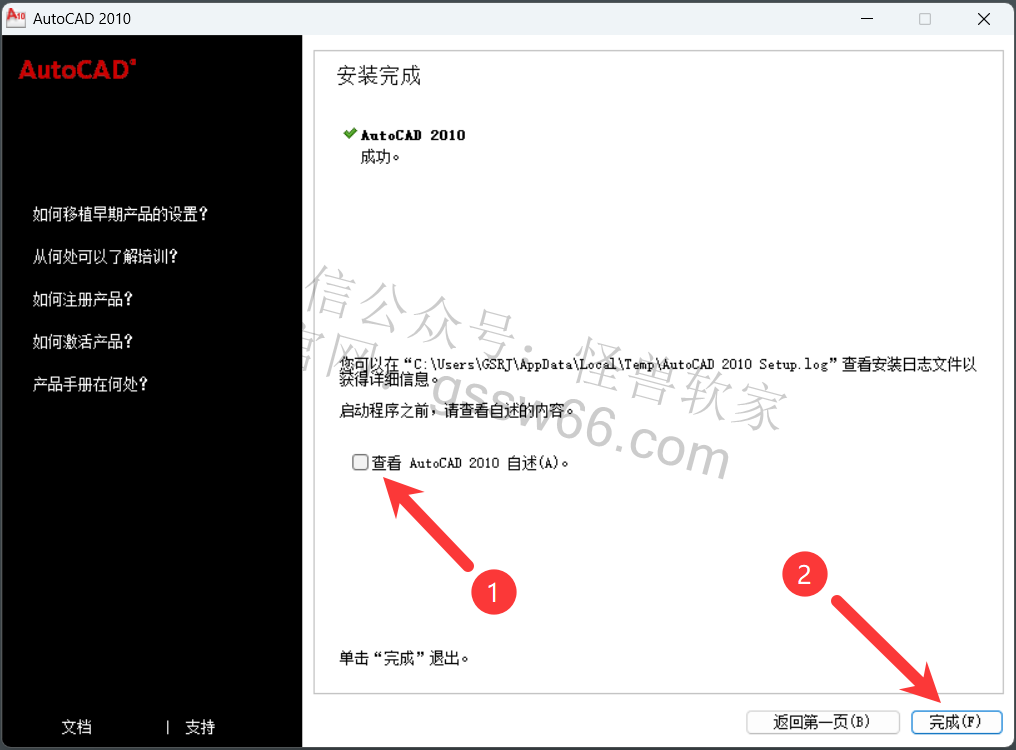 18,取消勾选“查看AutoCAD 2010自述”,点击“完成”