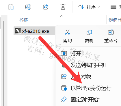 25,找到并选中“xf-a2010.exe”程序,点击鼠标右键,点击“以管理员身份运行”