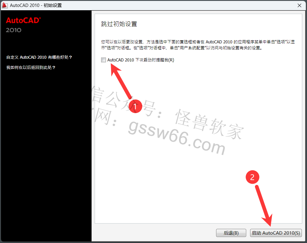 21,取消勾选“AutoCAD 2010下次启动时提醒我”,点击“启动 AutoCAD 2010”