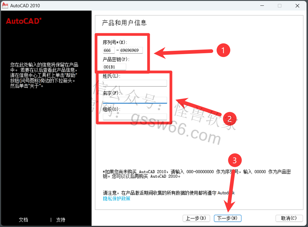 12,输入序列号“666-69696969”,产品密钥“001B1”,用户信息随便输入,点击“下一步”