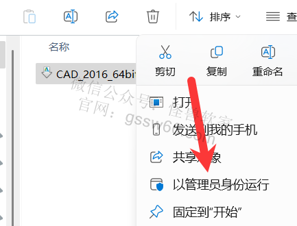 04,找到并选中“CAD_2016_64bit.exe”安装程序,点击鼠标右键,点击“以管理员身份运行”