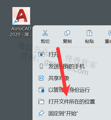 15,在桌面找到并选中AutoCAD软件图标,点击鼠标右键,点击“打开文件所在的位置”